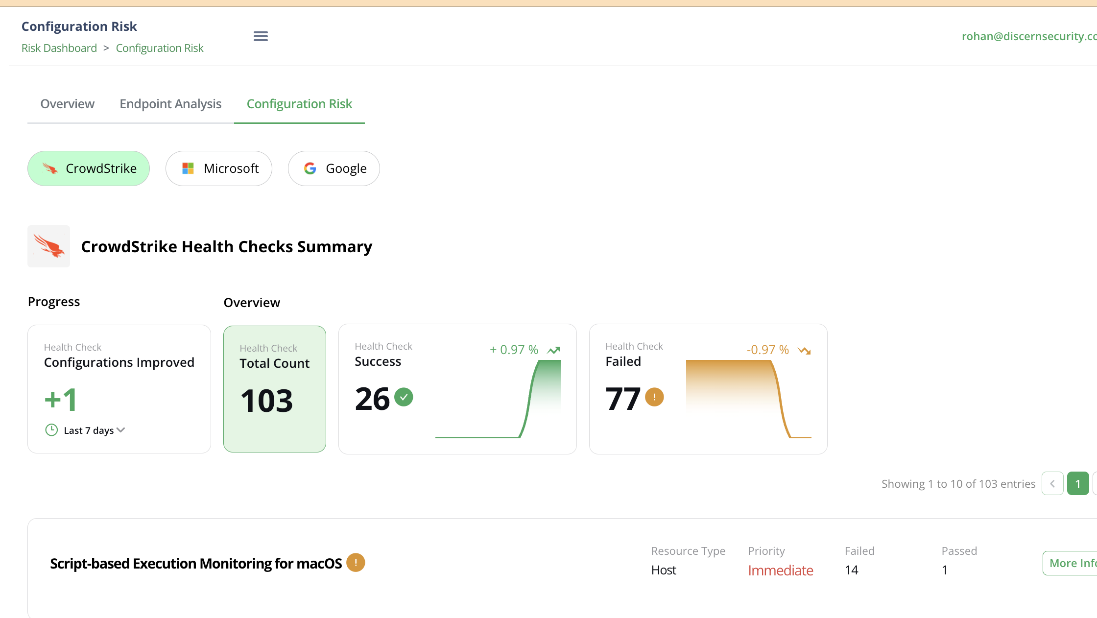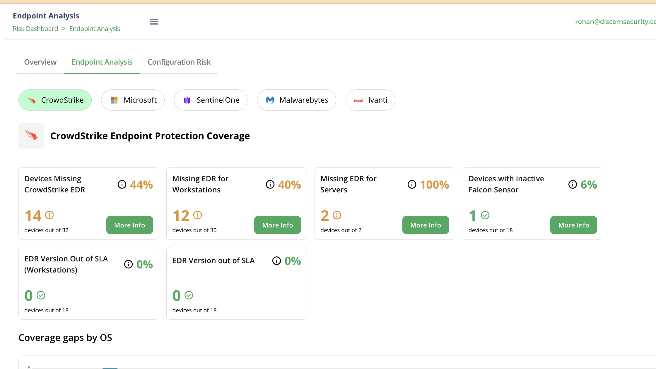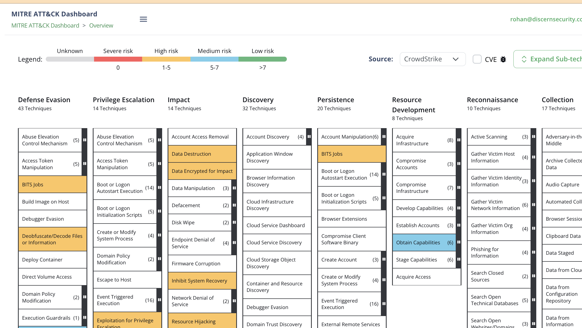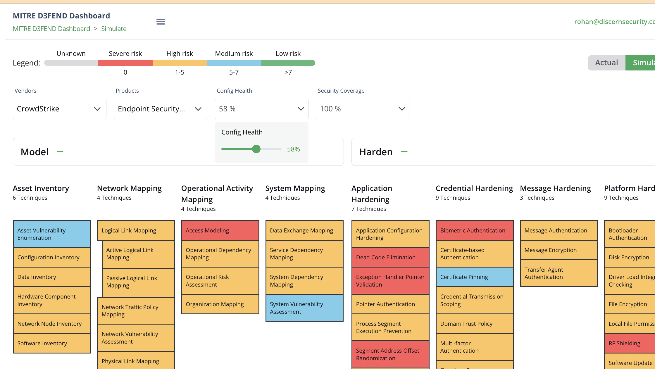 Discern Security empowers you to assess your security controls, and map them to standards like MITRE and Center for Internet Security (CIS), to then optimize your overall coverage. With Discern and CrowdStrike, you can seamlessly map the CrowdStrike Falcon® platform‘s active controls and risk data to MITRE or CIS frameworks, and see which controls should be turned on based on your organization‘s risk profile, helping you harden your security posture against modern threats.