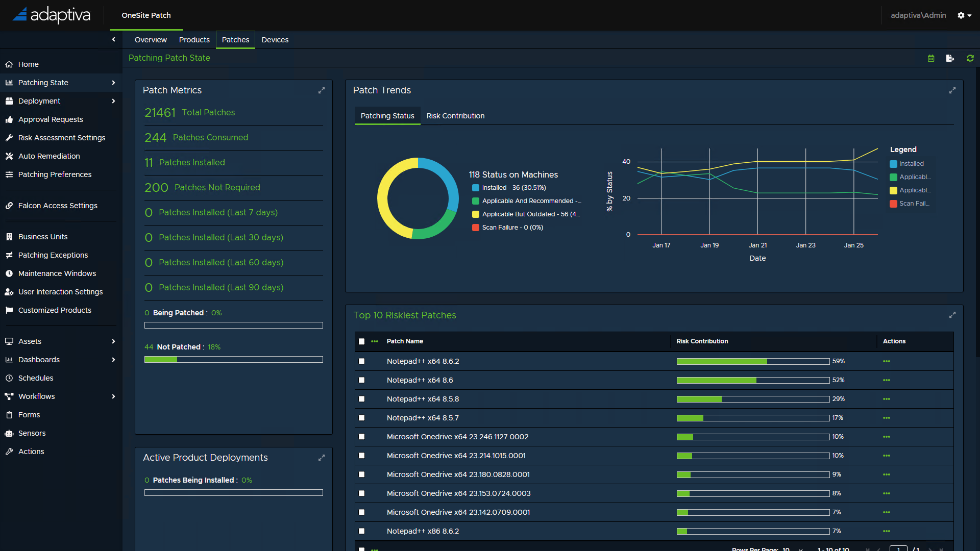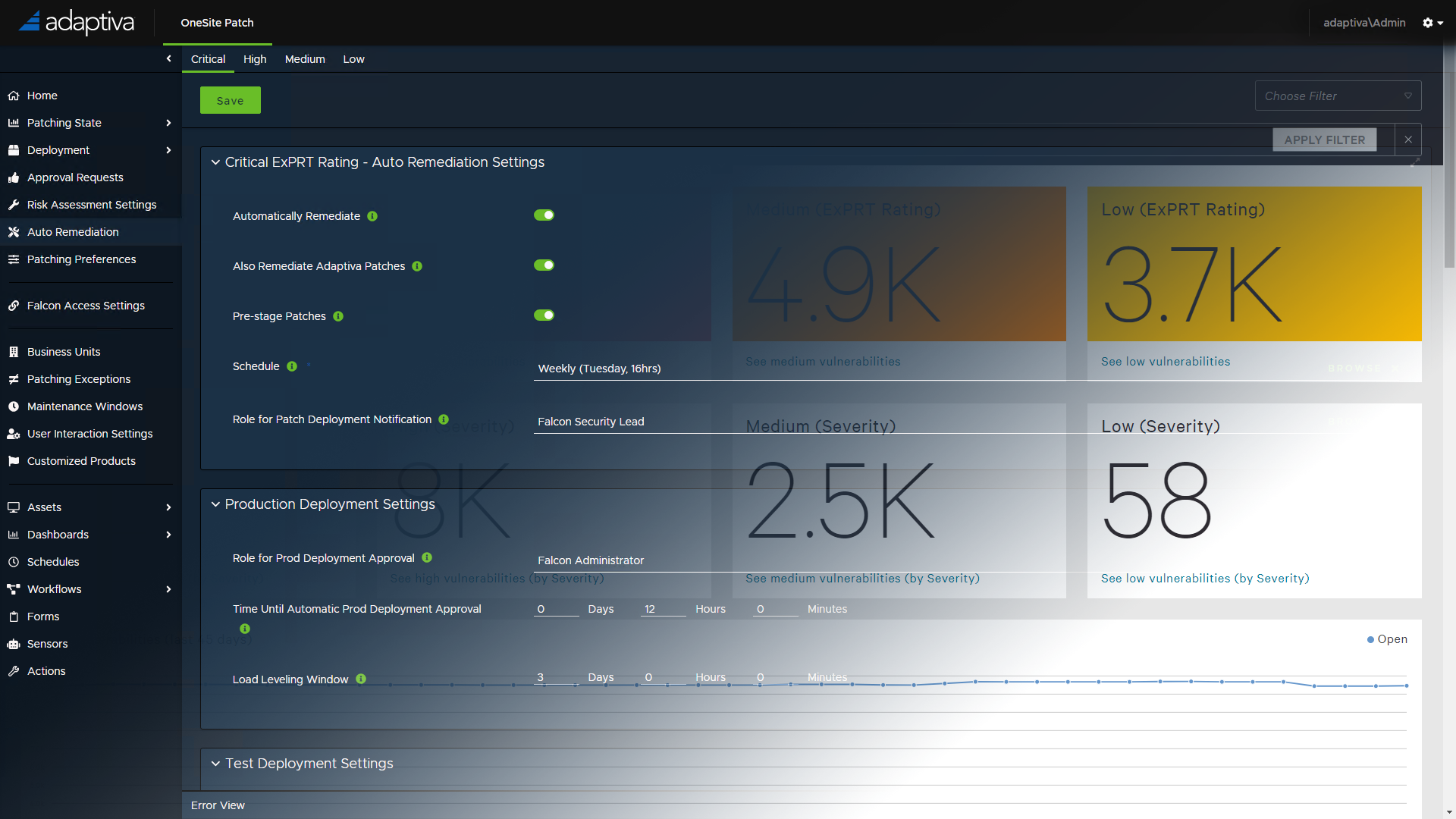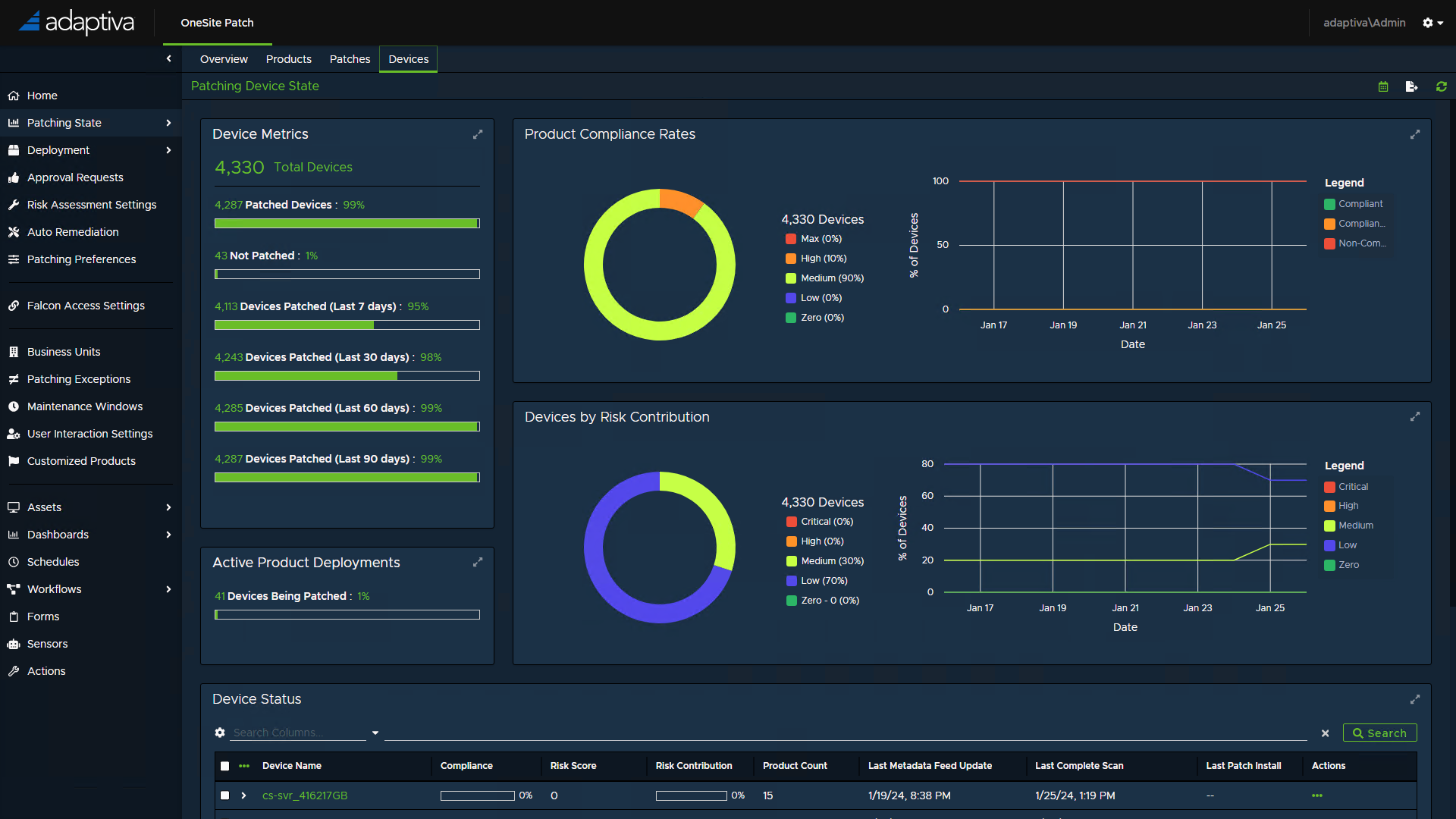 With Adaptiva and CrowdStrike, you can stay ahead of cyberthreats and maximize productivity. Adaptiva OneSite Patch‘s integration with CrowdStrike Falcon® Exposure Management vulnerability data helps you safeguard your organization and streamline operations by automatically patching critical vulnerabilities and prioritizing the rest using real-time ExPRT data from the CrowdStrike Falcon platform. Set custom patching settings to align with your organization's specific business and security requirements, then OneSite Patch continuously automates deployment and approval processes to rapidly remediate vulnerabilities at scale.