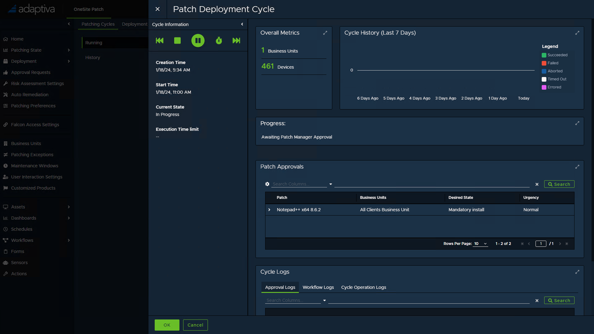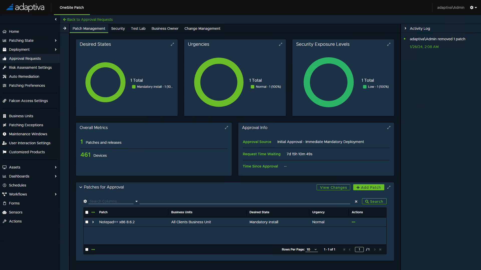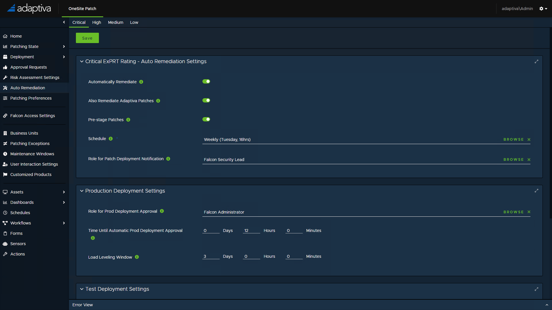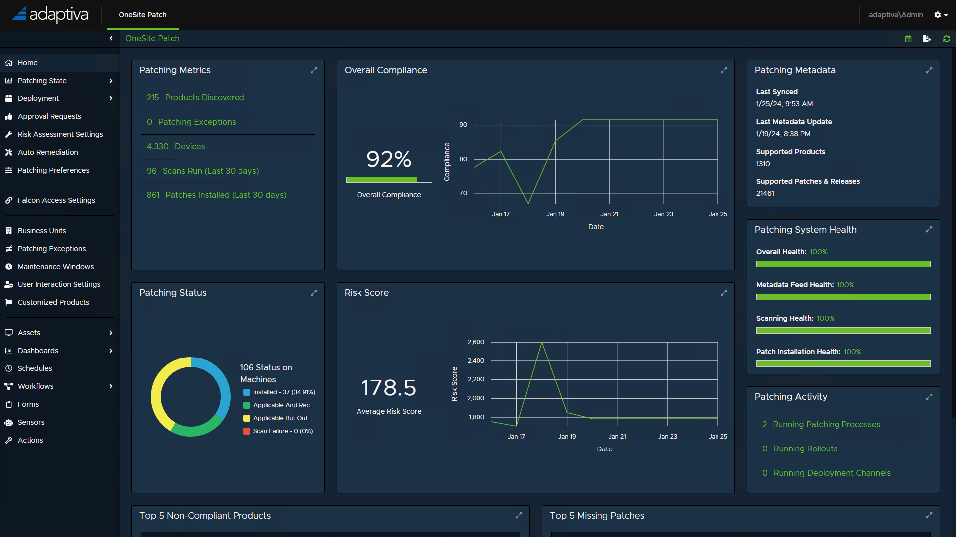 With Adaptiva and CrowdStrike, you can stay ahead of cyberthreats and maximize productivity. Adaptiva OneSite Patch‘s integration with CrowdStrike Falcon® Exposure Management vulnerability data helps you safeguard your organization and streamline operations by automatically patching critical vulnerabilities and prioritizing the rest using real-time ExPRT data from the CrowdStrike Falcon platform. Set custom patching settings to align with your organization's specific business and security requirements, then OneSite Patch continuously automates deployment and approval processes to rapidly remediate vulnerabilities at scale.