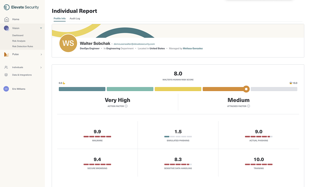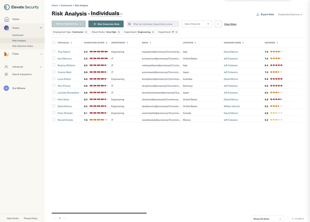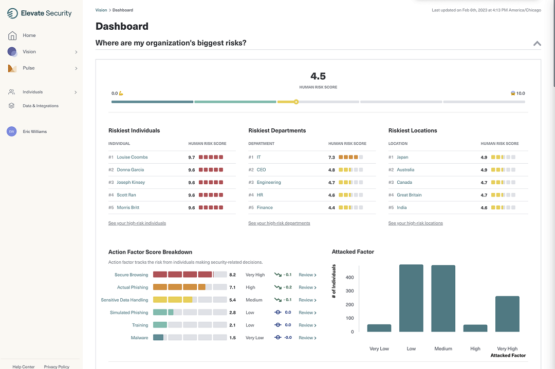 Elevate Security allows security teams to quickly assess and mitigate risky employees and employ automated playbooks to adaptively respond to potential threats. Elevate‘s seamless integration with CrowdStrike leverages APIs to provide a comprehensive view of employee behavior and threats. By leveraging the CrowdStrike Falcon® platform‘s enriched security data, security teams get a rapid assessment of risky employees based on their actions, frequency they‘re targeted, and by whom they are targeted, alongside a scalable, tailored approach to managing risk.