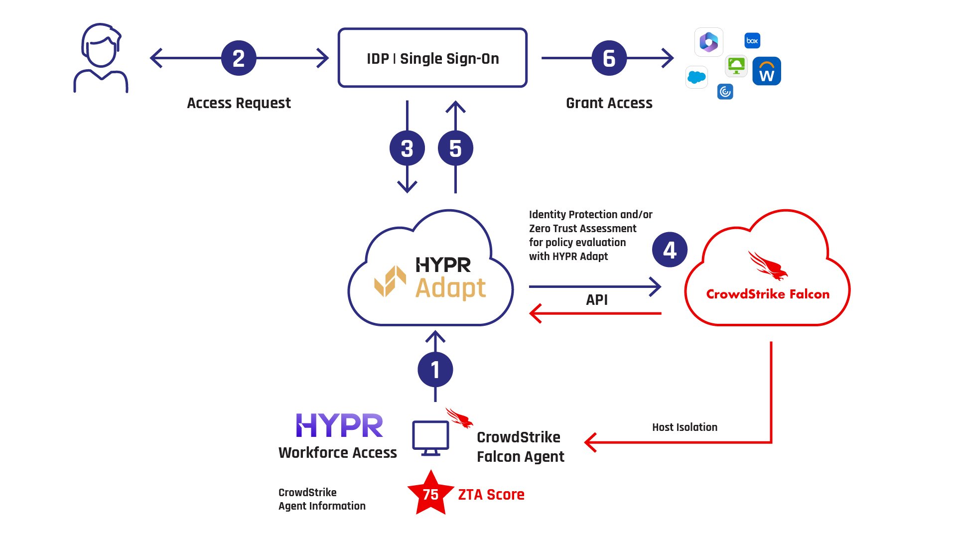 HYPR, a leader in passwordless identity assurance, unifies identity and endpoint risk insights and device posture assessments from the CrowdStrike Falcon® platform. HYPR enforces adaptive identity access policies based on changing device and identity posture from the Falcon platform, including CrowdStrike Falcon® Zero Trust Assessment (ZTA) and CrowdStrike Falcon® Identity Protection risk scores. This enables your team to eliminate siloed identity and device security information and safeguard the business end-to-end.