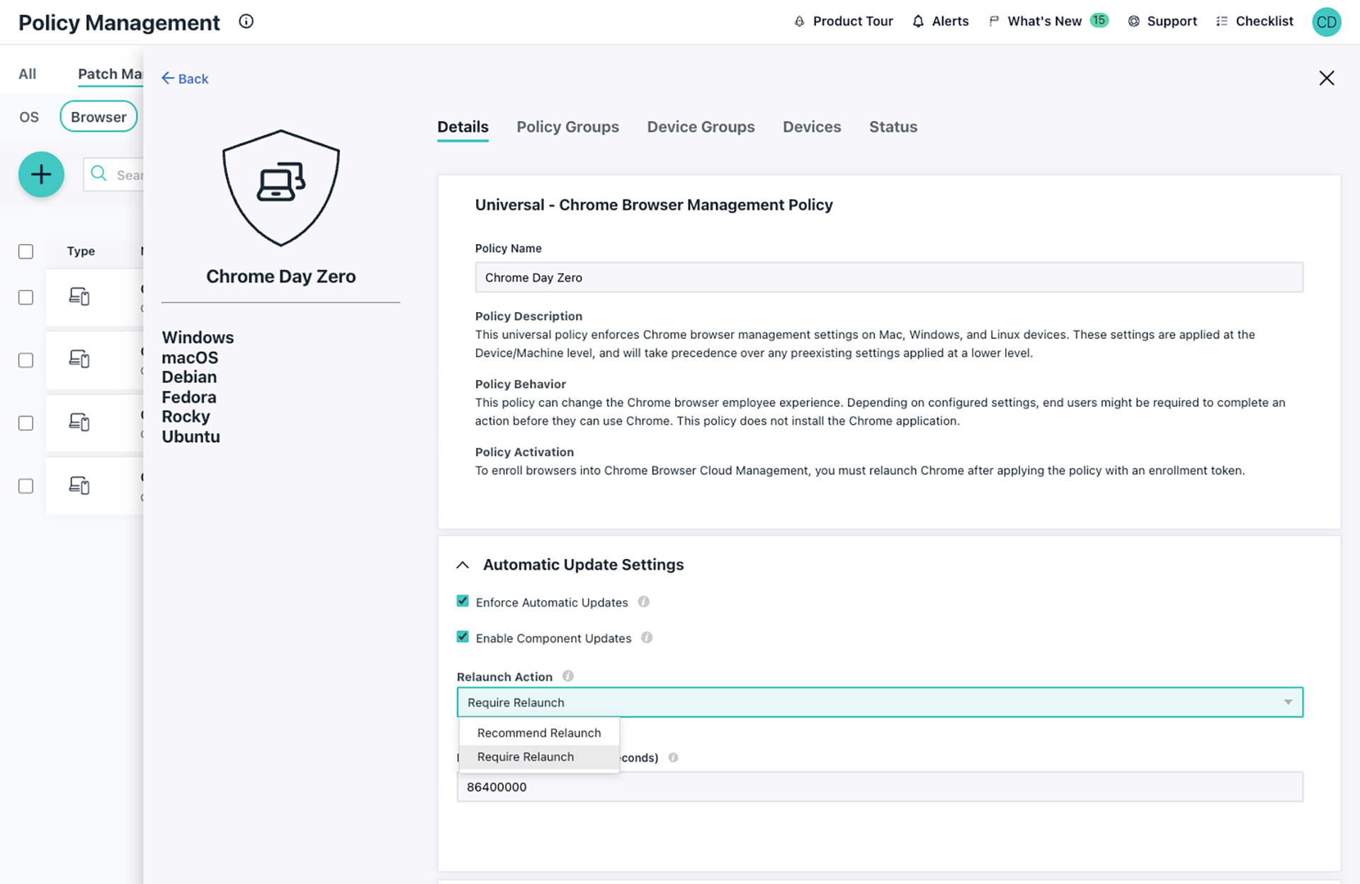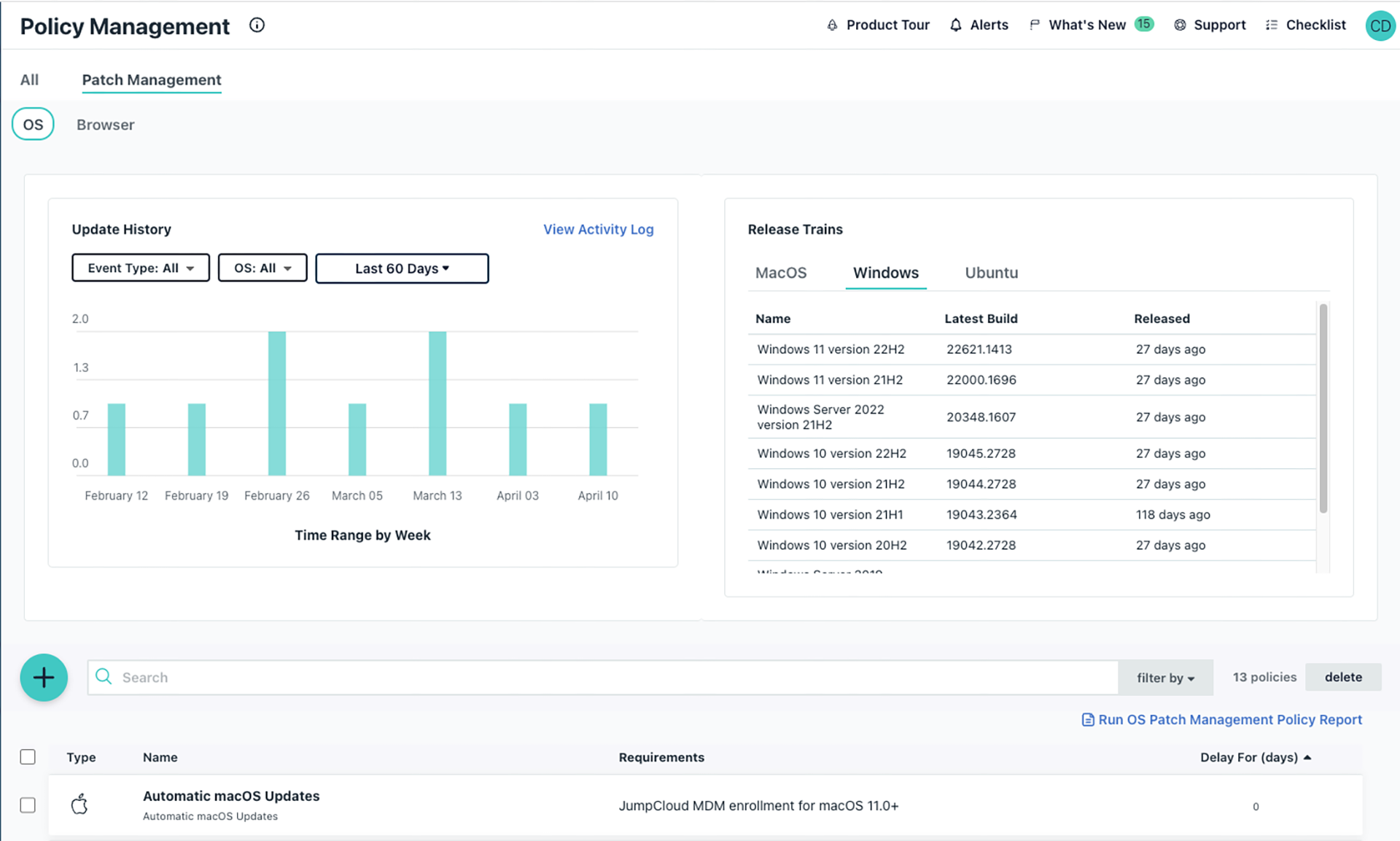 Ensure your organization is running on the most up-to-date technology to eliminate risk and vulnerability. Enable automatic patch management for major and minor OS updates and browsers. The JumpCloud integration with the CrowdStrike Falcon platform makes it easy to deploy the JumpCloud agent across your entire fleet.