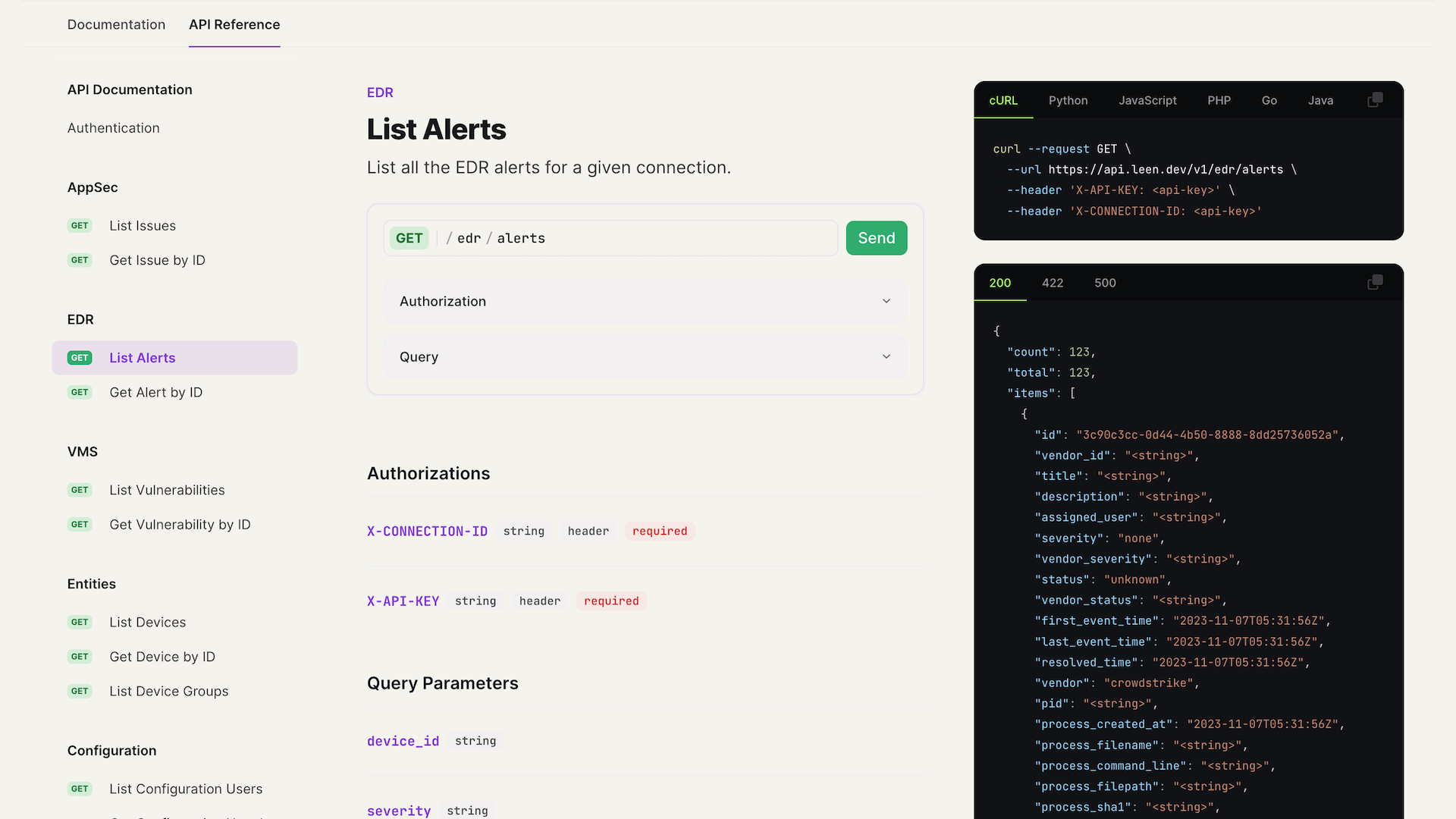 Leen is a unified API for security data, enabling product and engineering teams to integrate once and access data from hundreds of security tools, including the CrowdStrike Falcon platform. By ingesting CrowdStrike‘s rich endpoint and vulnerability telemetry, Leen seamlessly correlates data across diverse security products, eliminating blind spots and enhancing threat detection. With Leen and CrowdStrike, teams get improved security coverage and more informed decision-making for various use cases including cyber insurance underwriting, security compliance and more.