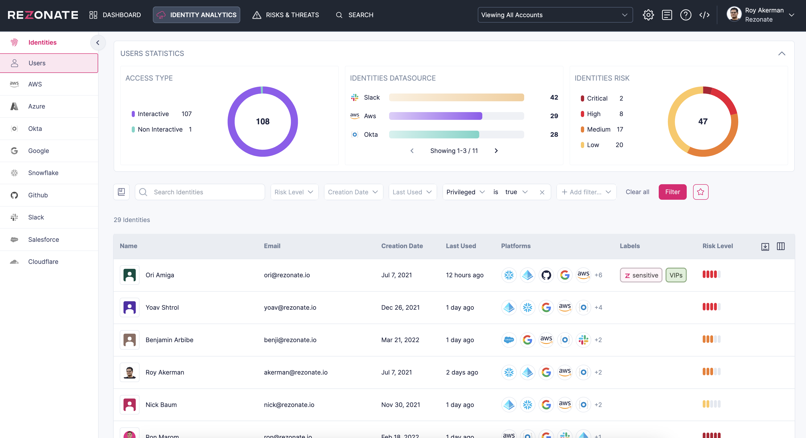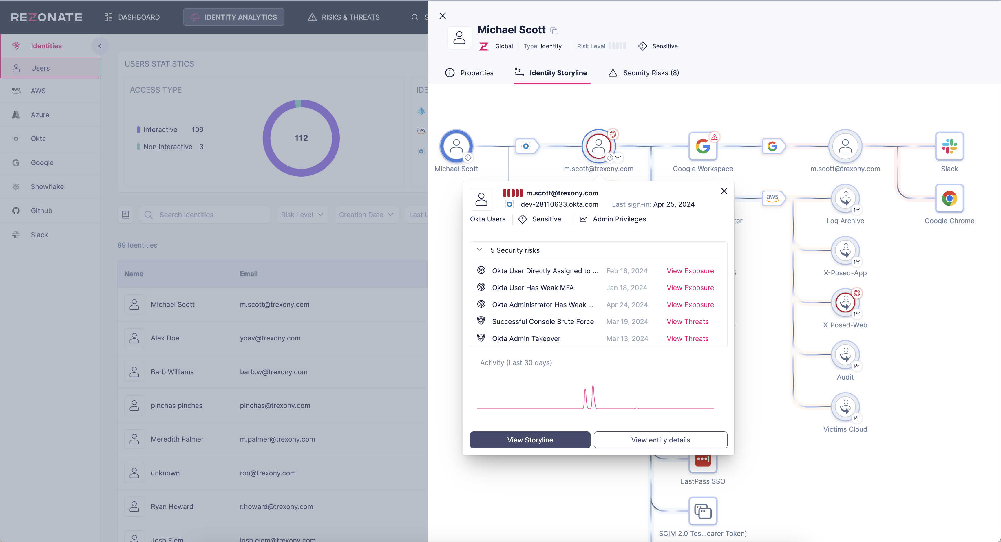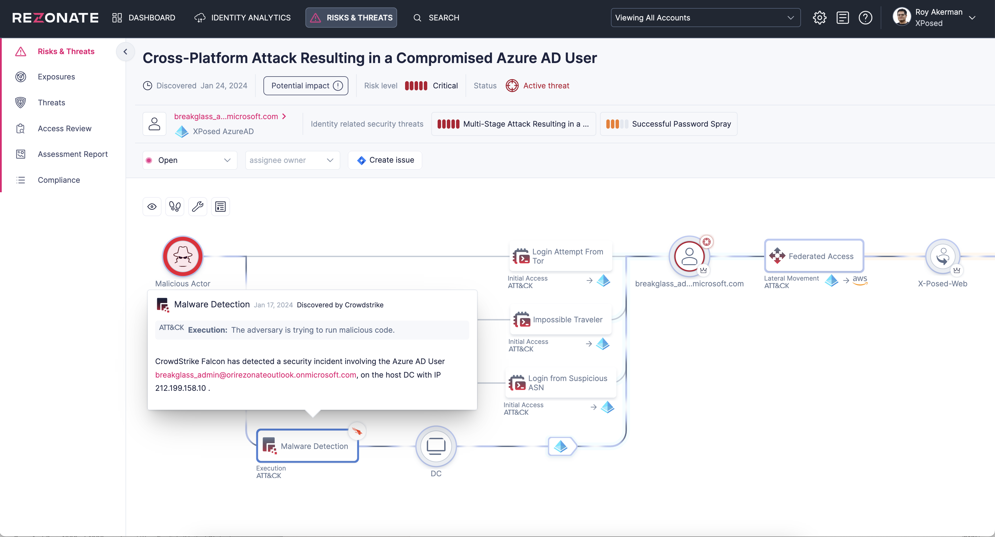 Rezonate integrates with the CrowdStrike Falcon® platform to extend threat detection, response, and attack analysis to identities across cloud, SaaS, and identity providers. With this integration, SOC analysts can seamlessly correlate user-machine and cloud identity data, monitor activity, and assess the potential impact of compromised endpoints on cloud privileges. By bilaterally sharing threat signals and enabling response actions across the CrowdStrike and Rezonate platforms, security teams can detect and block lateral movement between on-premises and cloud environments, stopping attacks at any stage.