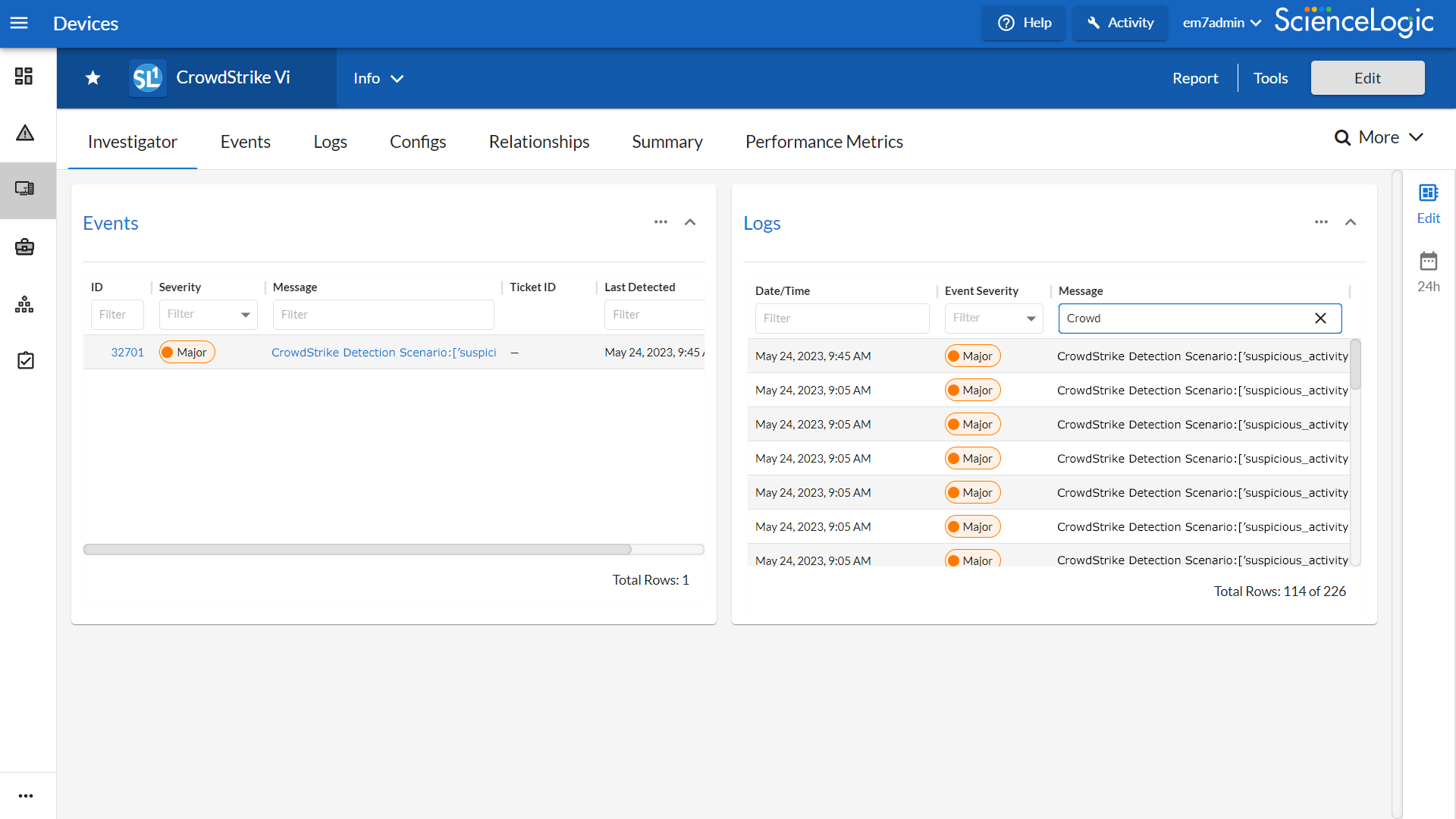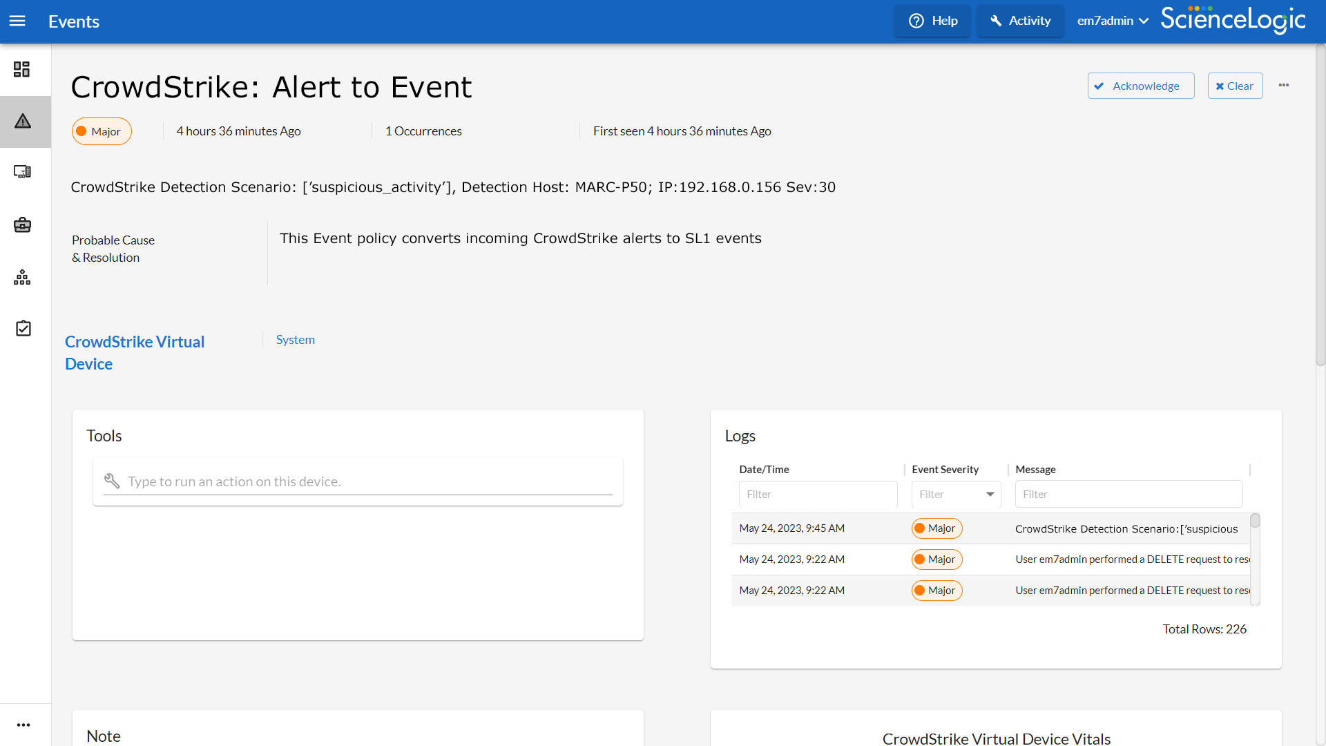 ScienceLogic SL1 allows you to gain visibility across multi-cloud and distributed architectures, contextualize operational data, and quickly act using robust integrations and automation. The ScienceLogic integration with the CrowdStrike Falcon® platform allows security teams to accelerate their operations by improving threat detection and automating response - all within a single interface. When a security detection occurs within the Falcon platform, such as potential malware on a device, the detection will be automatically sent to ScienceLogic as an event. From there, SL1 can simultaneously create an incident to document the issue and trigger predefined responses to swiftly stop attacks before they cause damage.