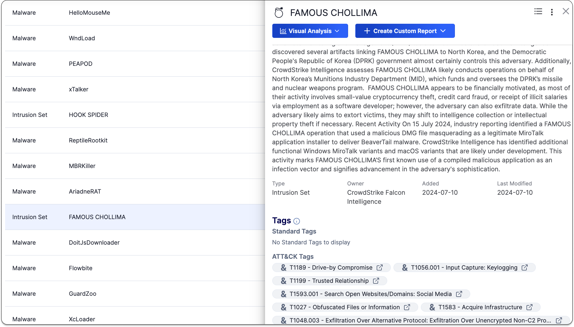 The integrations with CrowdStrike enables cyber threat intel and security operations teams to incorporate CrowdStrike Adversary Intelligence into a Unified Threat Library in the Threat Intelligence Operations (TI Ops) Platform, and shares Intel with Falcon Insight XDR to detect and block threats.