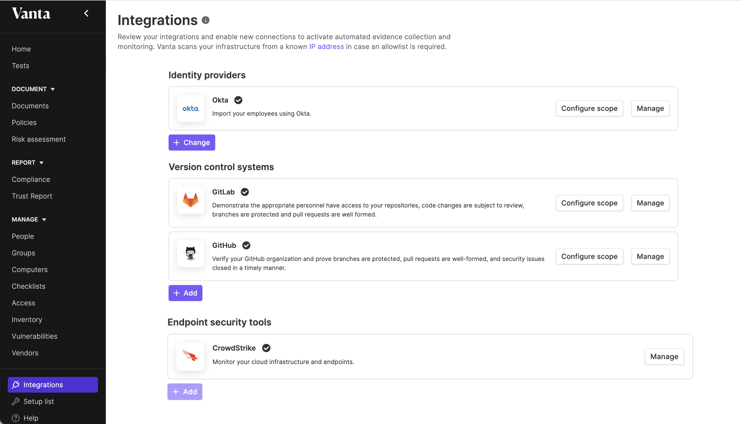 Vanta helps you scale security practices and automate compliance for the industry‘s most sought after standards - SOC 2, ISO 27001, HIPAA, PCI DSS, GDPR, and CCPA. By integrating Vanta with the CrowdStrike Falcon® platform, your team gains enhanced access management capabilities, helping you manage and ensure policy compliance of user access to the Falcon platform. With Vanta and CrowdStrike, you can simplify your security with robust visibility of user access and automated compliance checks.