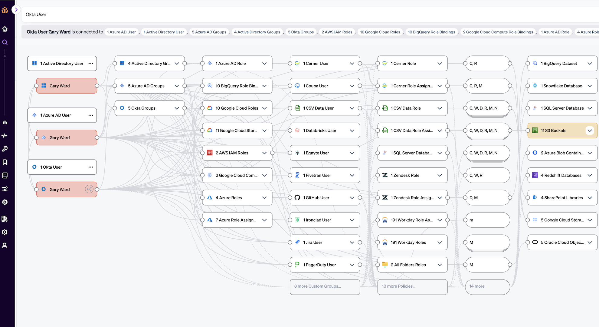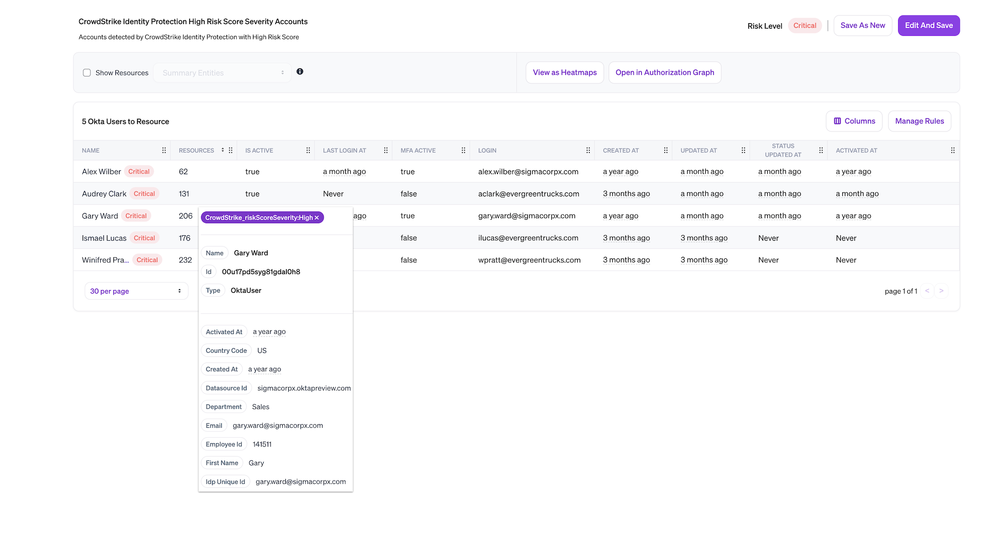 Veza makes it easy to find out who can take what action on what data within apps and databases across your organization - both on-premise and in the cloud. Veza automatically assesses which apps and objects are impacted by users that get flagged by CrowdStrike Falcon® Identity Protection. Veza tracks users and permissions created outside of the Identity Governance and Administration (IGA) tools to keep deactivated users from accessing sensitive data and intellectual property using the permissions that were granted directly within the apps.