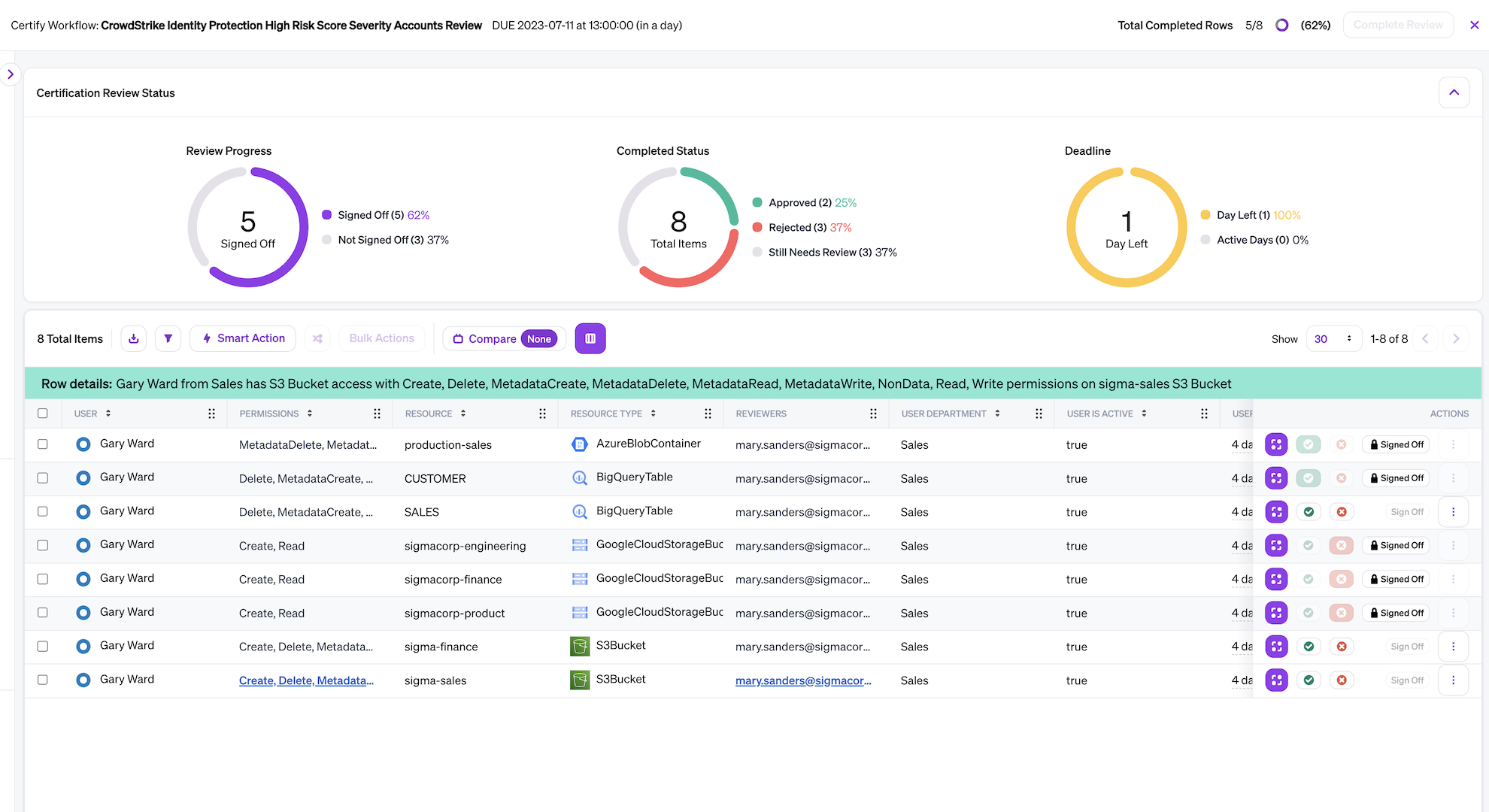 Run user access reviews on demand or triggered by CrowdStrike Identity Protection risk classification, certify and recertify access entitlements on all enterprise resources, cloud and on-premise. Understand the reality of effective permissions for any user, service account, or resource.