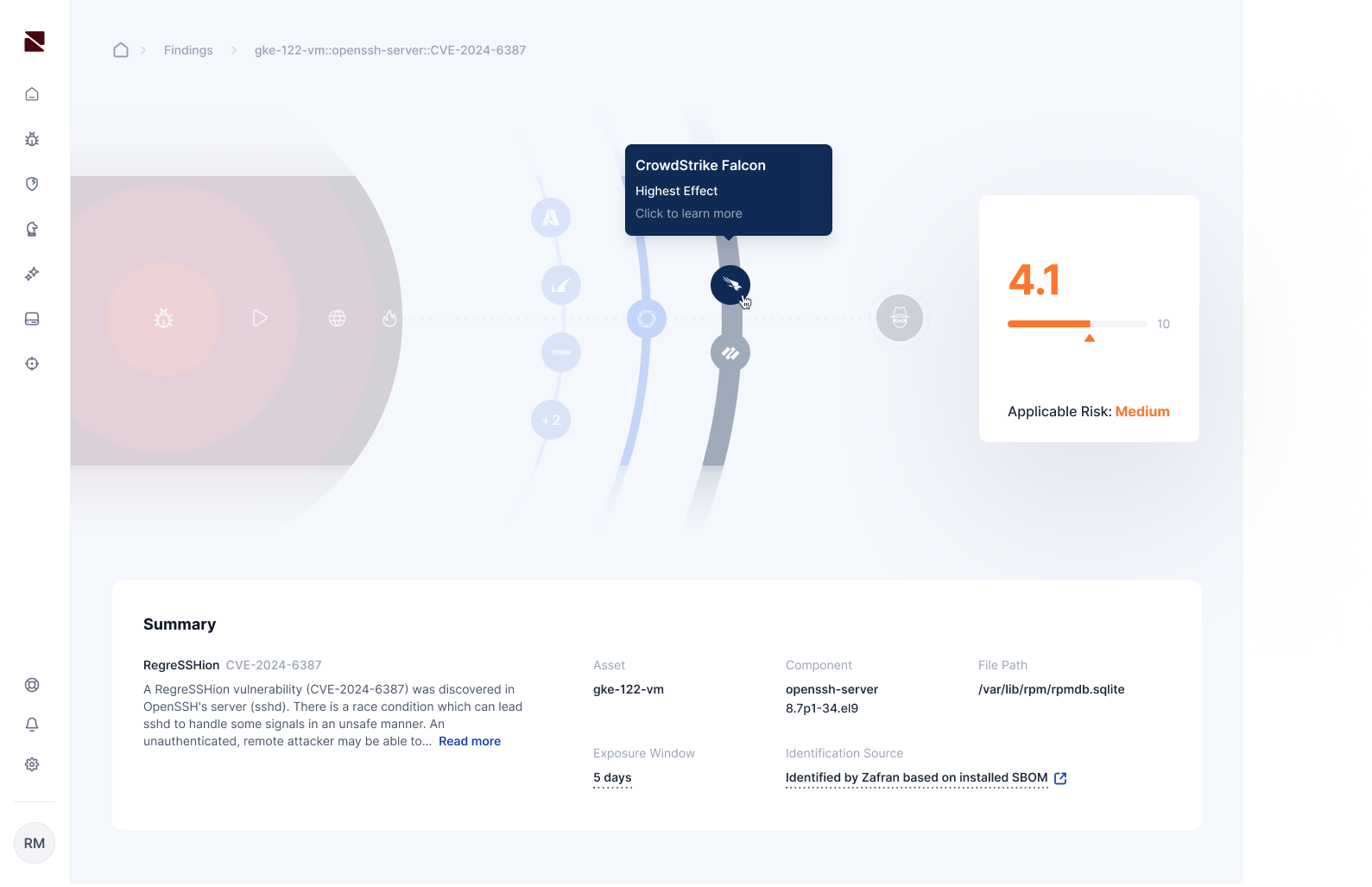 Zafran integrates with CrowdStrike to collect, correlate, and enrich host, vulnerability, and prevention policy data. The CrowdStrike data, alongside data from other security controls, are processed in the Zafran platform, creating a comprehensive overview of the organization's exposure and a detailed action plan for SecOps teams