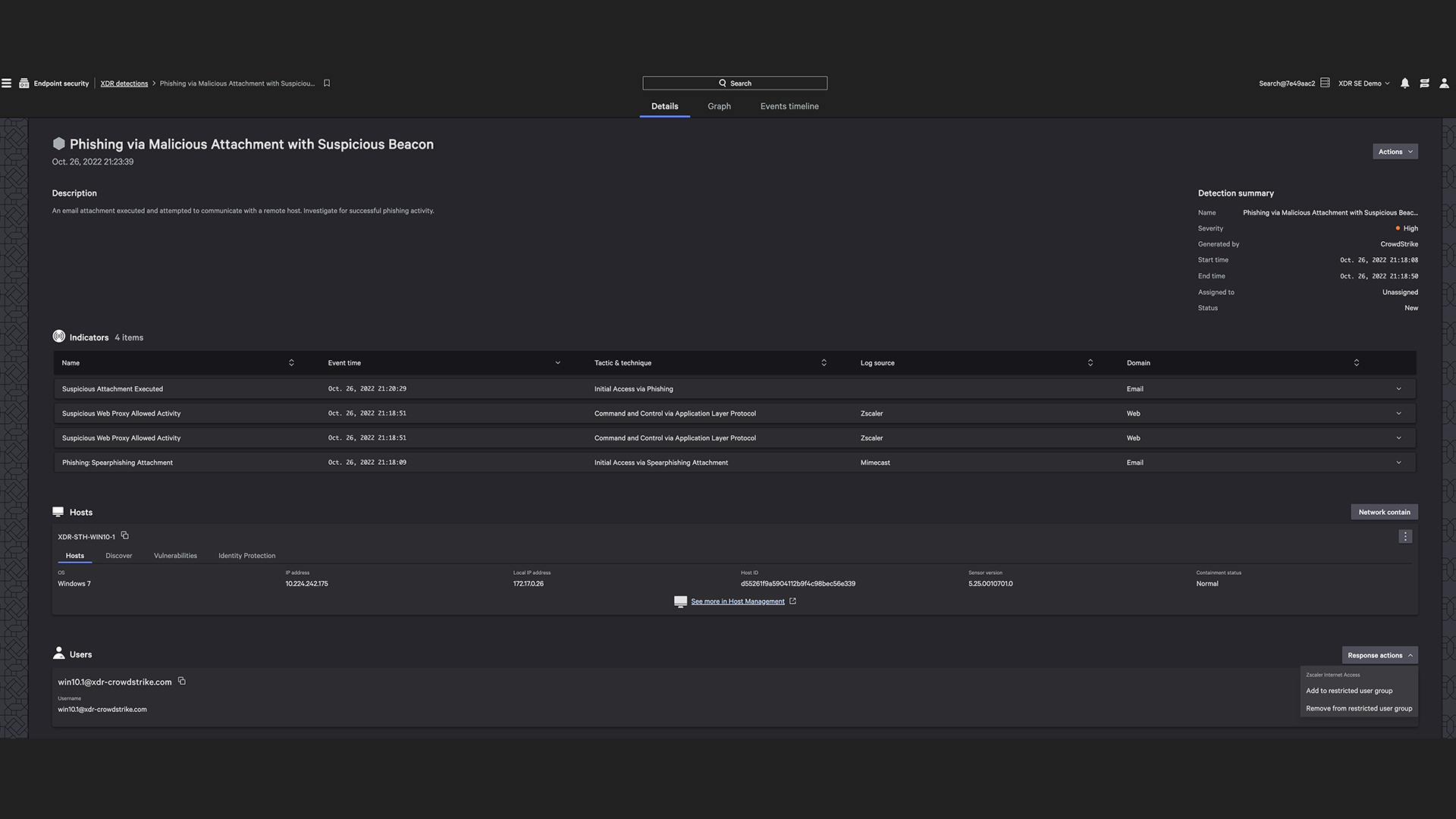 Streamline cross-domain response actions for faster and more precise incident handling using CrowdStrike Falcon Insight XDR and Zscaler Internet Access (ZIA™). This integration enables automated responses, including user access restrictions through Zscaler Browser Isolation, effectively mitigating advanced threats.